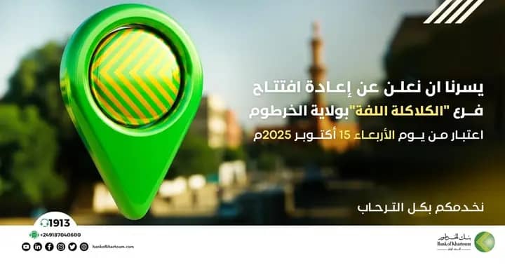 Home » بنك الخرطوم يعلن إعادة افتتاح فـرع الكلاكلةاللفة أخباراقتصادسلايدر بنك الخرطوم يعلن إعادة افتتاح فـرع الكلاكلةاللفة المنبر 24 أكتوبر 14, 2025 3 Views الخرطوم؛ المنبر 24 عملائنا الأعزاء، يسرنا ان نعلـن عن إعـادة افتتاح فـرع #الكلاكلة_اللفة بولاية الخرطوم، اعتبارًا مـن يـوم الأربعـاء 15 أكتـوبـر 2025م شارك هذا الموضوع:تدوينةطباعةالبريد الإلكترونيTelegramWhatsApp