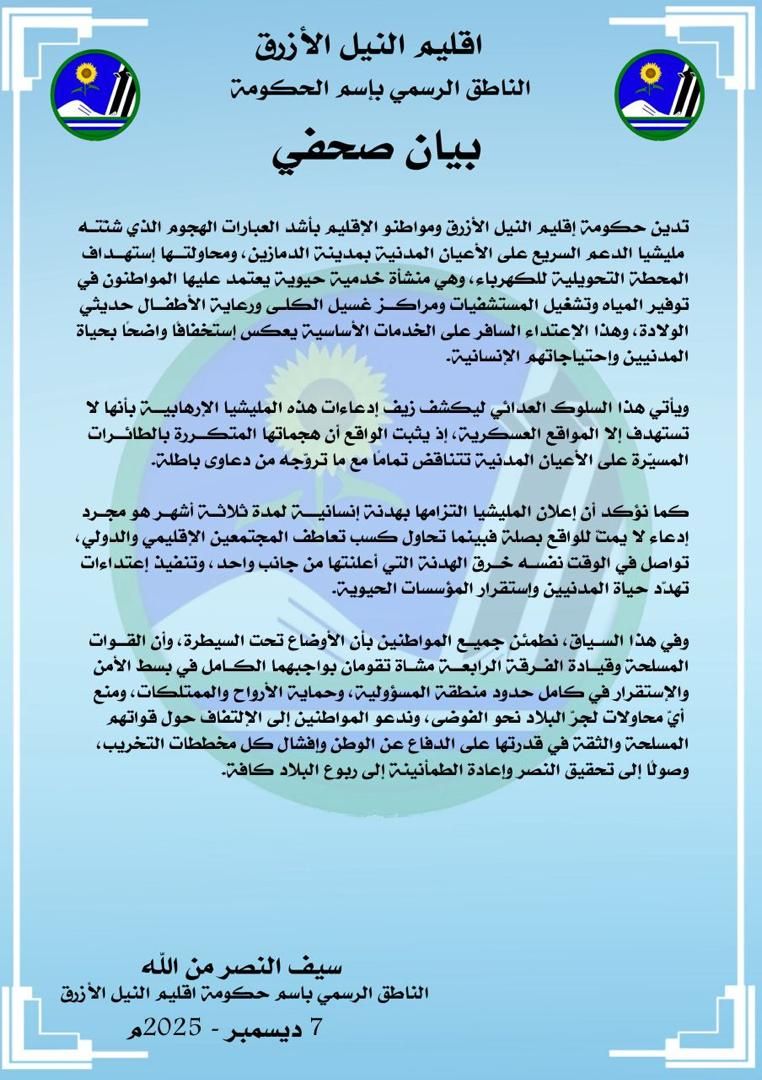 اتهمت حكومة إقليم النيل الأزرق، ميلي-شيا الد-عم الس-ريع، بمحاولة استهدافها المحطة التحويلية للكهرباء، إثر هجومها على الأعيان المدنية في مدينة الدمازين.