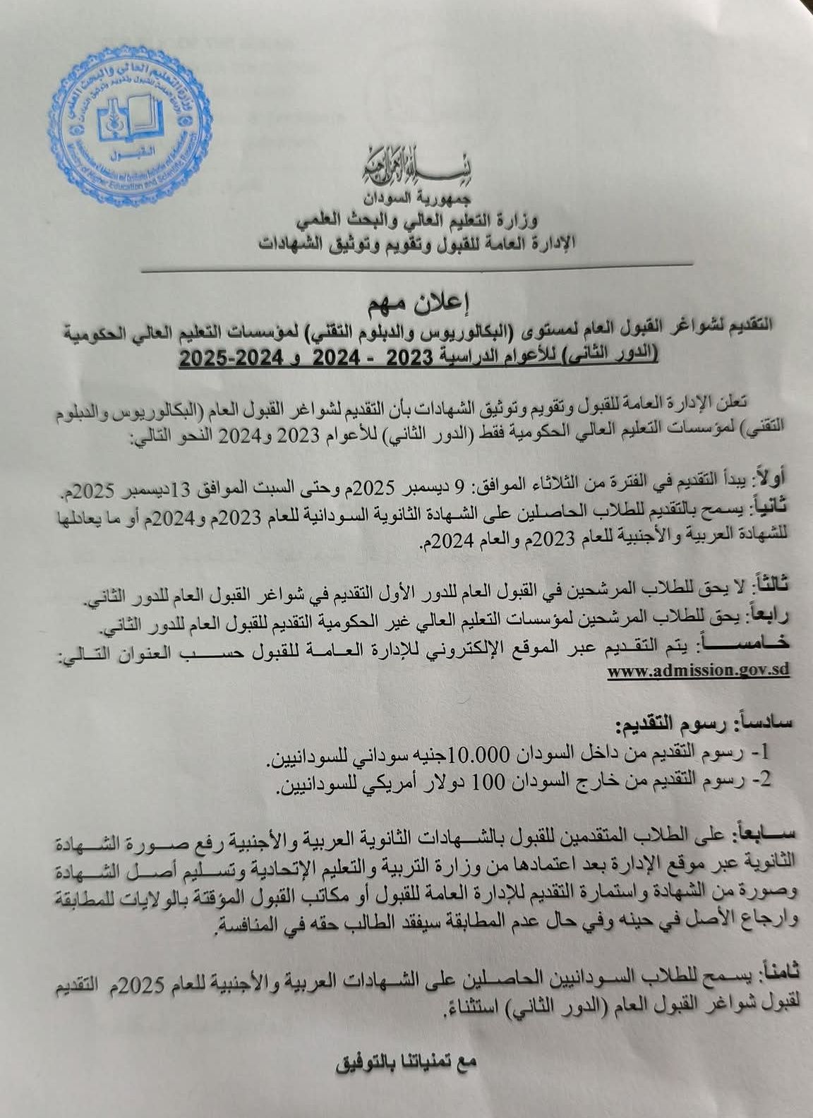 وسيبدأ التقديم اعتبارًا من يوم غدٍ الثلاثاء الموافق 9 ديسمبر وحتى السبت الموافق 13ديسمبر الجاري، وسيسمح بالتقديم للطلاب الحاصلين على الشهادة الثانوية السودانية للعام 2023و2024 أو ما يعادلها للشهادة العربية والأجنبية للعام 2023والعام 2024.