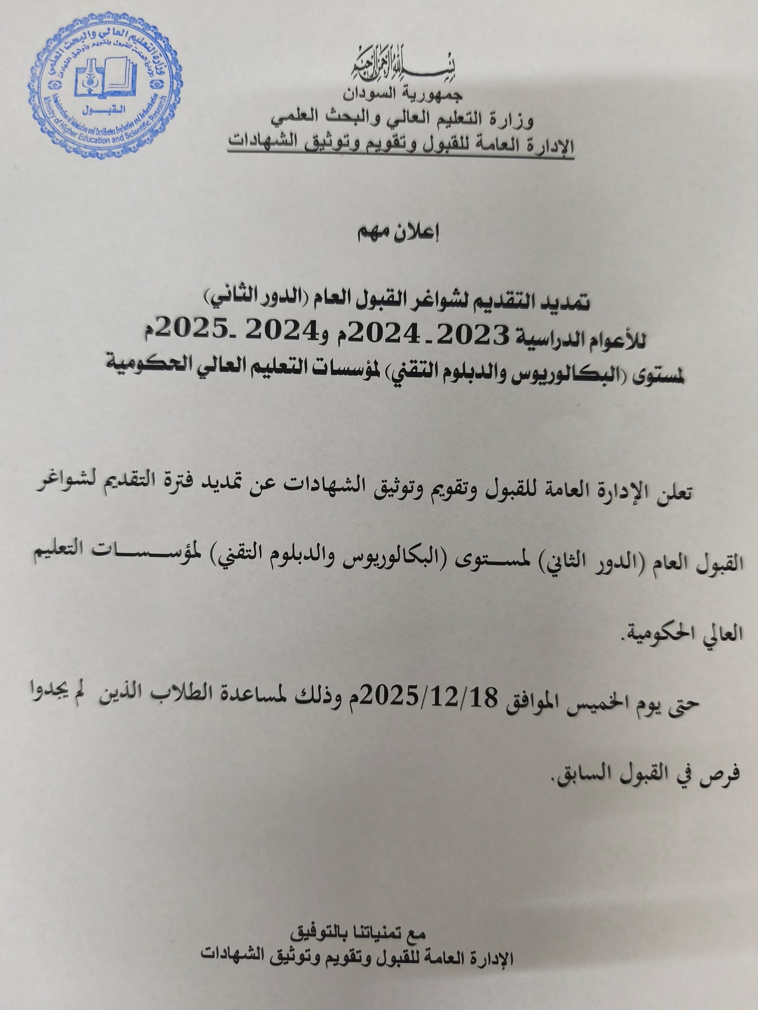 أعلنت الإدارة العامة للقبول وتقويم وتوثيق الشهادات بوزارة التعليم العالي عن تمديد فترة التقديم لشواغر القبول العام للدور الثاني للأعوام 2023–2024 و2024–2025، وذلك لمستويي البكالوريوس والدبلوم التقني بمؤسسات التعليم العالي الحكومية.
