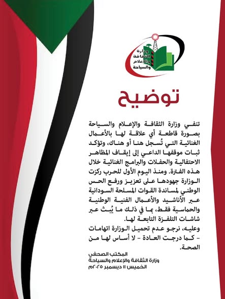 ودعت الوزارة إلى تركيز الجهود لتعزيز ورفع الحس الوطني لمساندة القوات المسلحة السودانية عبر الأناشيد والأعمال الفنية الوطنية والحماسية فقط، بما في ذلك ما يُبث عبر شاشات التلفزة التابعة لها.