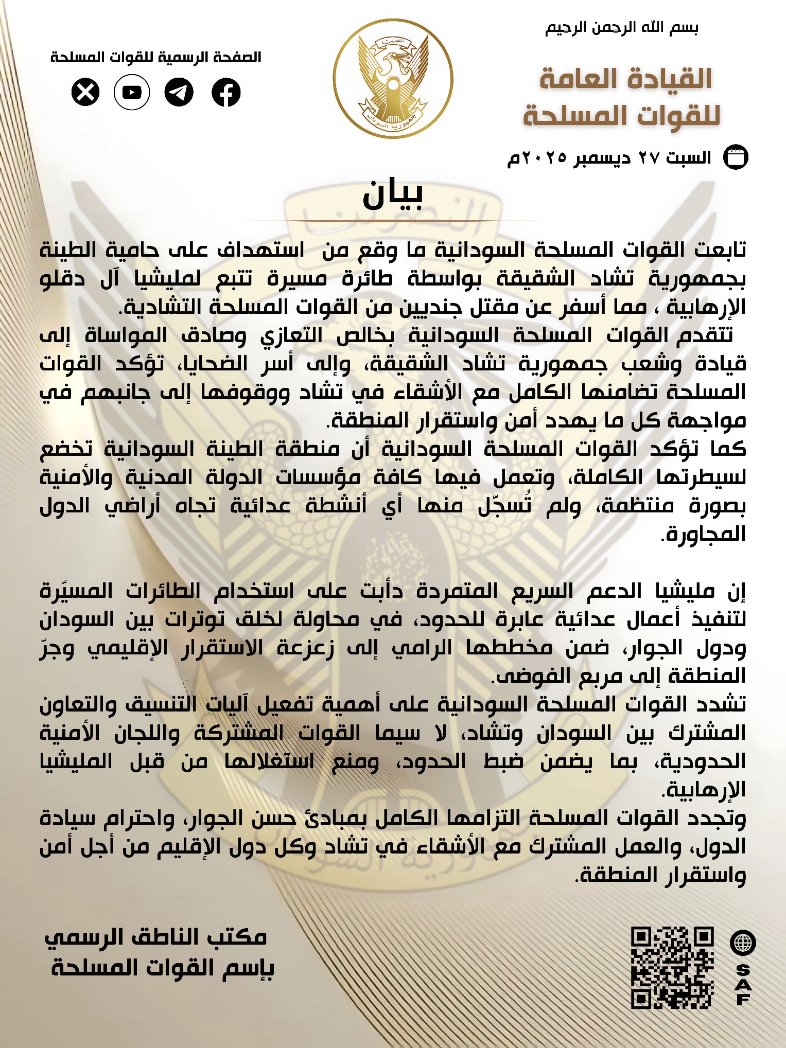 أعلن الجيش في السودان، تضامنه الكامل مع الأشقاء في تشاد ووقوفه إلى جانبهم في مواجهة كل ما يهدد أمن واستقرار المنطقة بعد حادثة استهداف حامية الطينة بجمهورية تشاد بواسطة طائرة مسيّرة تتبع لميلي-شيا الدع-م الس-ريع.