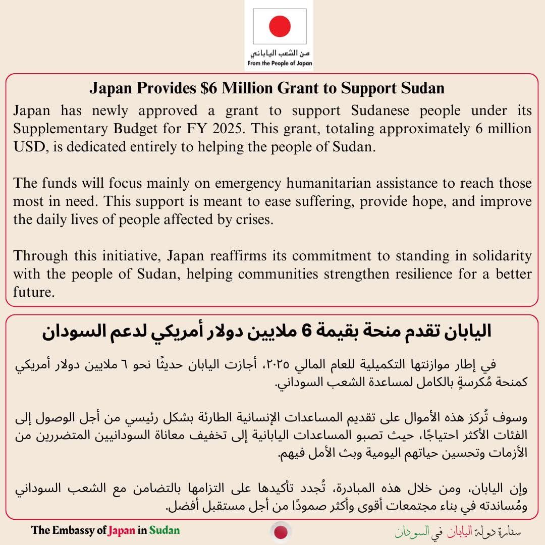 Home » اليابان تقدم منحة بقيمة 6 ملايين دولار لدعم السودان أخبارسلايدرسياسي اليابان تقدم منحة بقيمة 6 ملايين دولار لدعم السودان المنبر 24 ديسمبر 29, 2025 1 View الخرطوم: المنبر24 قررت الحكومة اليابانية تقديم منحة للعون الإنساني للسودان بقيمة ستة ملايين دولار ، وذلك في إطار دعمها المستمر والمتواصل للشعب السوداني لتقديم مواد إغاثية مختلفة للمتأثرين بالحرب من النازحين في شكل مواد غذائية وصحية. شارك هذا الموضوع:تدوينةطباعةالبريد الإلكترونيTelegramWhatsApp