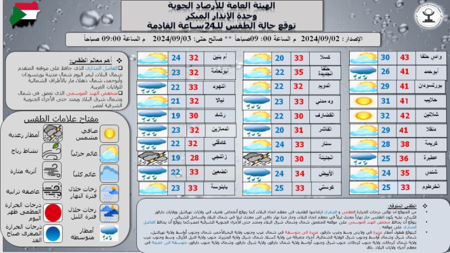 توقعت الهيئة العامة للأرصاد، أن تسجل درجات الحرارة انخفاضا طفيفا مع أجواء معتدلة نهارًا وباردة ليلًا شمالي البلاد وشمال ولايات كردفان ودارفور على أن تكون دافئة في بقية المناطق.