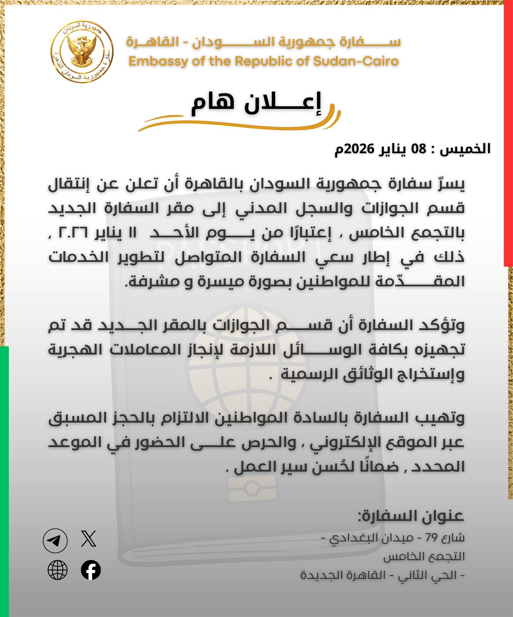 أعلنت سفارة جمهورية السودان بالقاهرة عن انتقال قسم الجوازات والسجل المدني إلى مقرّ السفارة الجديد بالتجمّع الخامس اعتبارًا من يوم الأحد الحادي عشر من يناير الجاري.