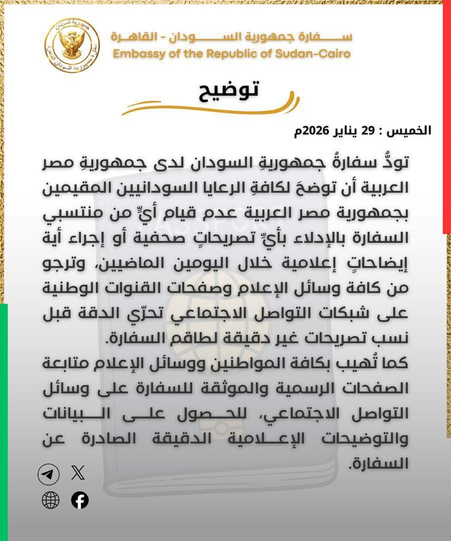 توضيح مهم لسفارة السودان بالقاهرة