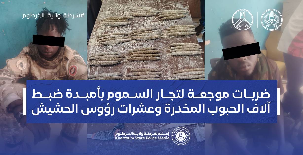 أعلنت شرطة ولاية الخرطوم عن تمكن عناصر المباحث في محلية أم بدة، بالتعاون مع أجهزة الاستخبارات العسكرية، من ضبط متهمين بحوزتهم عدد1,140 حبة مخدرة بمنطقة سوق ليبيا.