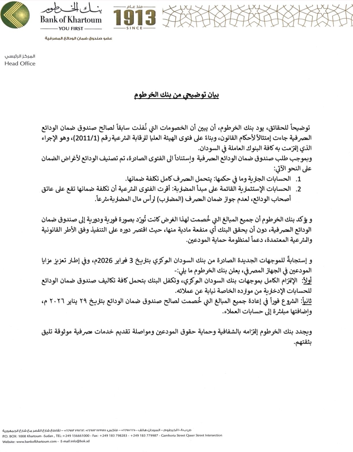 أولا: الإلتزام الكامل بموجهات بنك السودان المركزي، وتكفل البنك بتحمل كافة تكاليف صندوق ضمان الودائع للحسابات الإدخارية من موارده الخاصة نيابة عن عملائه. ثانيا: الشروع فوراً في إعادة جميع المبالغ التي خُصمت لصالح صندوق ضمان الودائع بتاريخ ۲۹ یناير ٢٠٢٦ م،