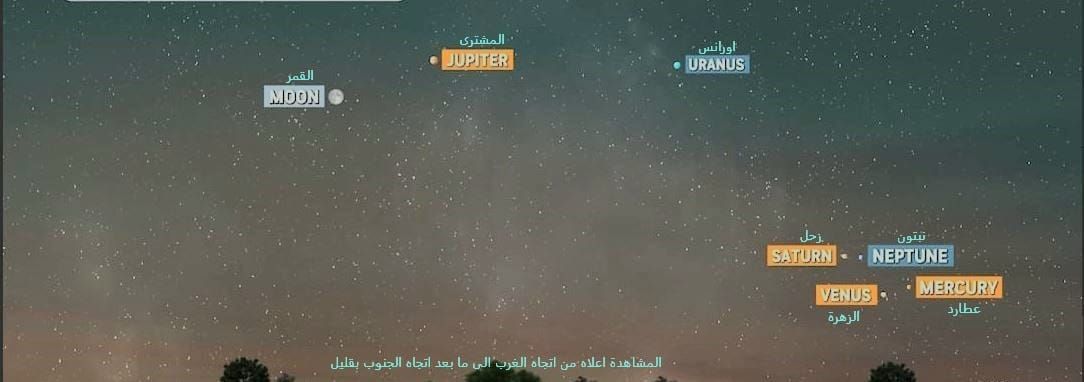 وأضاف أن كوكبي الزهرة والمشتري يعدان الأكثر وضوحاً للعين المجردة بعد الغروب، بينما يكون عطارد وزحل أقل سطوعاً ويظهران بصعوبة قرب الأفق، في حين يتطلب رصد أورانوس ونبتون استخدام تلسكوب.