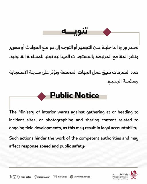حذّرت وزارة الداخلية القطرية مواطنيها من التجمّهر أو التوجّه إلى مواقع الحوادث، أو تصوير ونشر المقاطع المرتبطة بالمستجدات الميدانية.