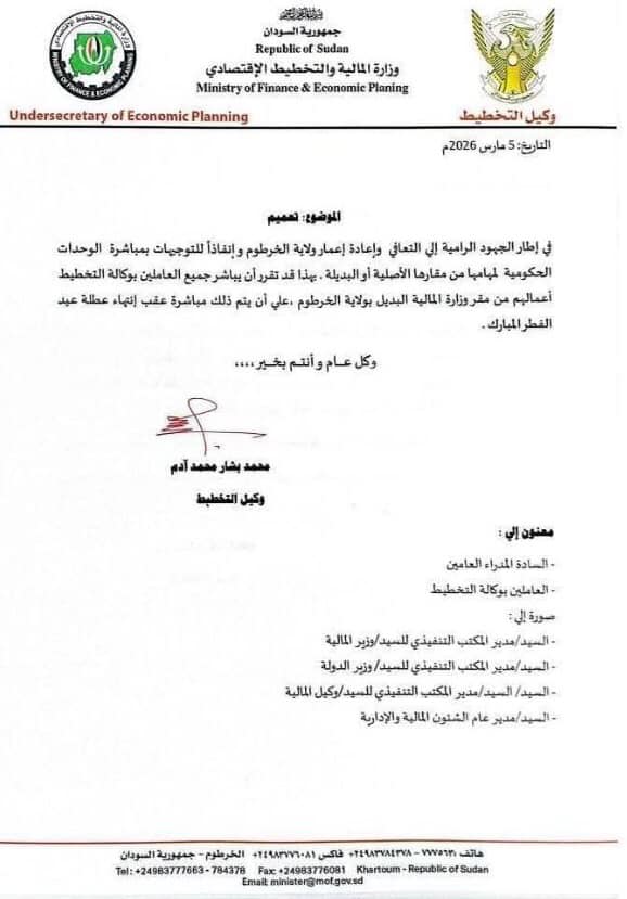 وجّهت وزارة المالية والتخطيط الاقتصادي، العاملين بمباشرة مهامهم بوكالة التخطيط من مقرّ وزارة المالية البديل بولاية الخرطوم عقب إنتهاء عطلة عيد الفطر المبارك.